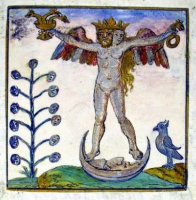 ALCHEMY’s,.. TREE OF LIFE/KNOWLEDGE, MANY HEADED WINGED BEING, BIRDS, SERPENTS,.. ALL WITH THE MAN/WOMAN ON THE MOON INDEED… in deed and in fact… too. FRICK AND CLICK… BETTER NOT… FALL…
