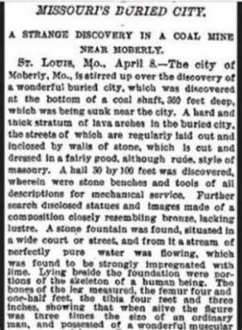 - Missouri: Clay County mounds; Poplar Bluff (…100 skeletons and Sun Temple…).
